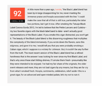 The Tatuaje Private Reserve, better known as Tat Black Label, was a blend that only Pete Johnson had his hands on. This was his private stick that he only gave out to a select few. Over the years this cigar became so sought after that the secondary market for this particular blend was causing issues amongst cigar aficionados. Where there was demand, supply was needed. The blend is undisclosed like most of Pete’s products but this cigar really hits home; the perfect blend between body and flavor.